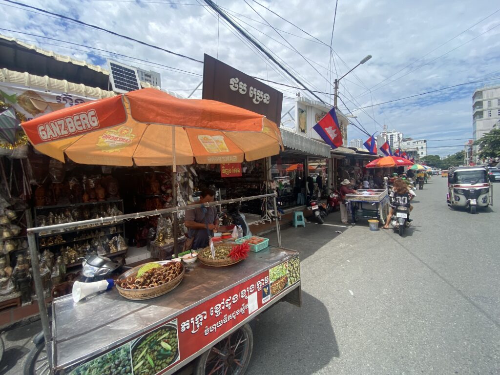 Si tratta di un mercato in cui potete trovare vestiti e oggetti da una parte, mentre la via lungo il fiume è letteralmente tappezzata di stand di cibo e non esagero quando dico che ce ne sono più di cento, tutte attaccate una all’altra, in cui potete trovare ogni sorta di cibo cambogiano e internazionale.