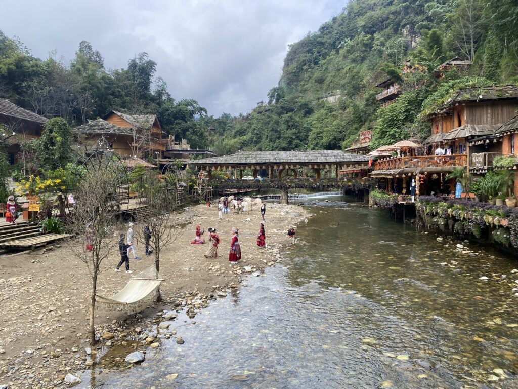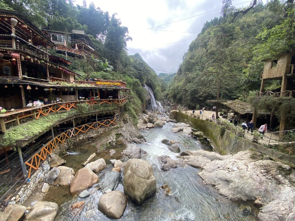 Appena si entra si passa per delle scalinate in mezzo a varie bancarelle che vendono vestiti e oggetti tipici, frutta secca e carne essiccata, per poi scendere a visitare il giardino delle rose.. proseguiamo ancora più verso il basso e arriviamo al punto secondo me più suggestivo di tutto il villaggio, ovvero il fiume e la cascata, in cui è possibile ammirare le varie strutture in legno che sorgono direttamente sulle sponde del fiume, per non parlare degli abitanti vestiti nel modo tradizionale Hmong.