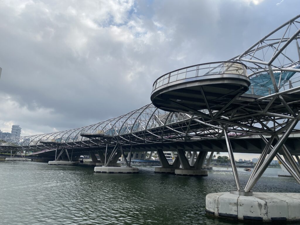 Appena di fianco a Marina Bay Sands si trova questo ponte molto particolare, l’Helix Bridge, proprio a forma di elica del DNA, il quale rappresenta la vita e la crescita di Singapore..questo inoltre si illumina di sera, creando uno spettacolo incredibile di luci proprio sullo skyline di Marina Bay.