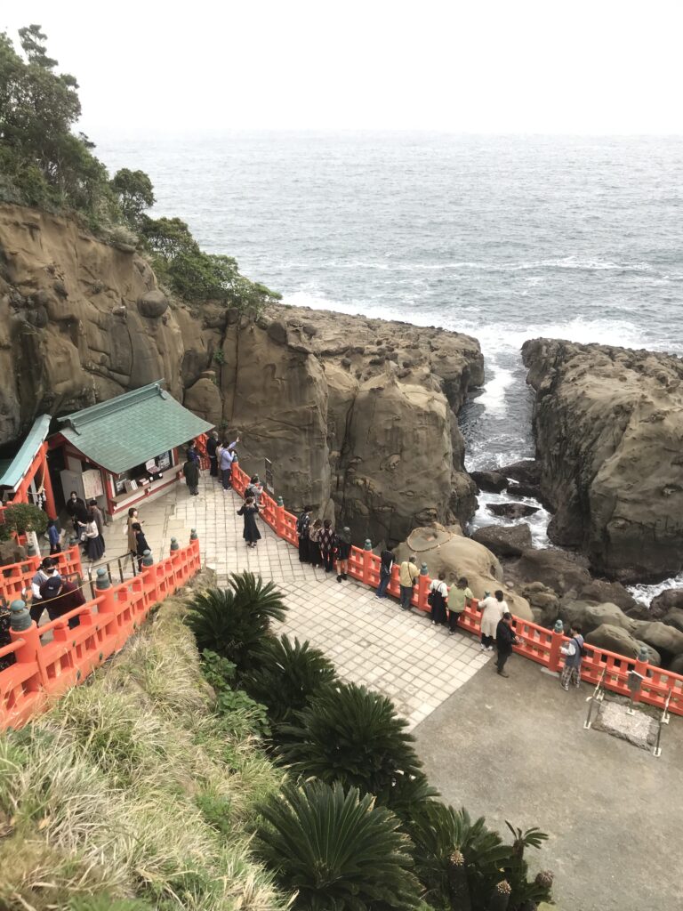 Un’oretta dopo la visita mi avanzava del tempo e ho scoperto che c’era questo tempio sull’oceano proprio sulla strada di ritorno, Udo Jingu, un santuario shintoista che valeva davvero di visitare.