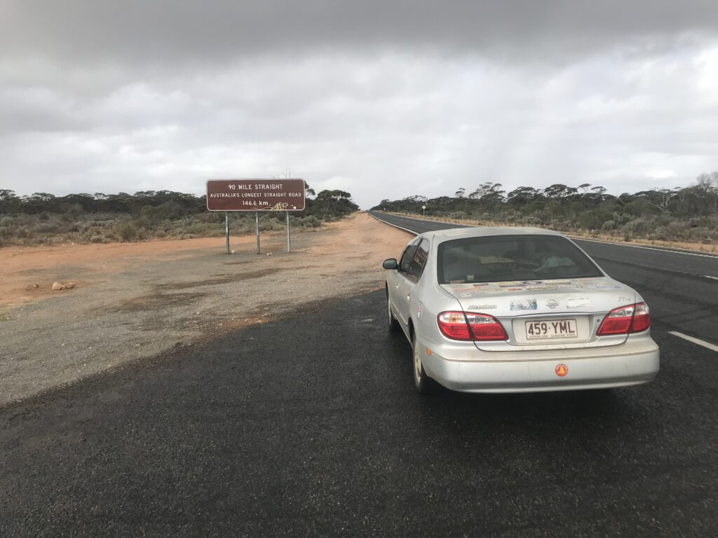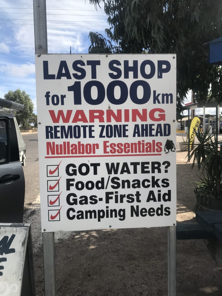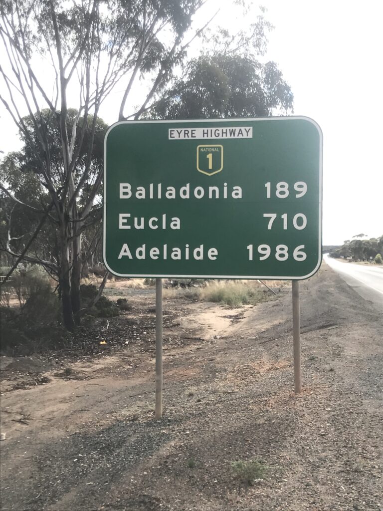 Da Esperance ci dirigiamo verso Norseman ed è proprio da qui che inizia il rettilineo, quindi mani sul volante e via, dopo circa 9 ore di guida e 4 stazioni di servizio arriviamo al confine col South Australia ad Eucla, in cui c’è addirittura un fuso orario particolare (UTC+8,45). Qui è presente un campeggio in cui è possibile passare la notte.