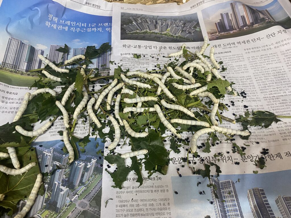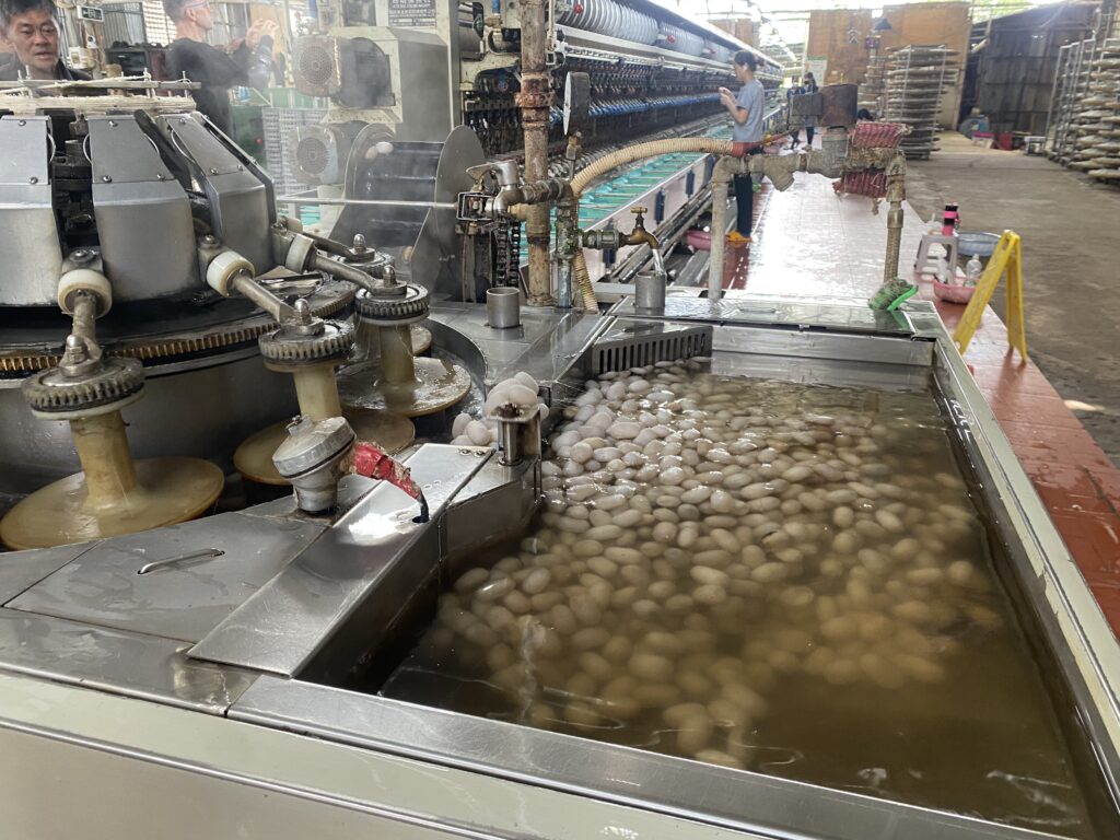 Il processo è molto interessante, i bachi vengono allevati e nutriti con foglie di gelso e formano i bozzoli, e quando questi ultimi sono pronti vengono prelevati e messi in acqua tra i 70 e i 90 gradi, in modo che il filo di seta venga dipanato e vengono formate le matasse.